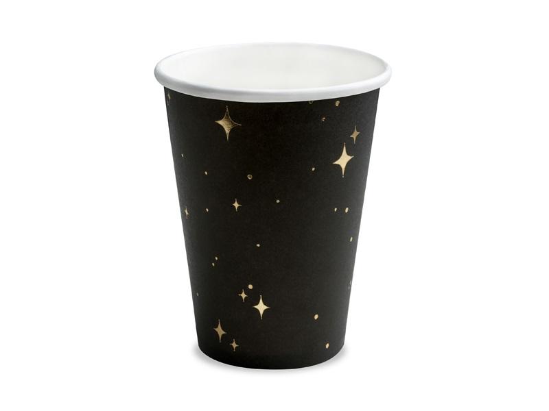 Kubeczki papierowe w kolorze czarnym ze złotym wzorem, pojemność ok. 260 ml. Kubki na napoje zawierają oznaczenia wymagane przez Rozporządzenie wykonawcze Komisji (UE) 2020/2151 z dnia 17 grudnia 2020 r. ustanawiające zasady dotyczące zharmonizowanych specyfikacji w odniesieniu do oznakowania produktów jednorazowego użytku z tworzyw sztucznych wymienionych w części D załącznika do dyrektywy Parlamentu Europejskiego i Rady (UE) 2019/904 w sprawie zmniejszenia wpływu niektórych produktów z tworzyw sztucznych na środowisko. Produkt zawiera etykietę wyłącznie w języku polskim, niemieckim, czeskim, francuskim, niderlandzkim, słowackim, słoweńskim i bułgarskim.(1 op. / 6 szt.)