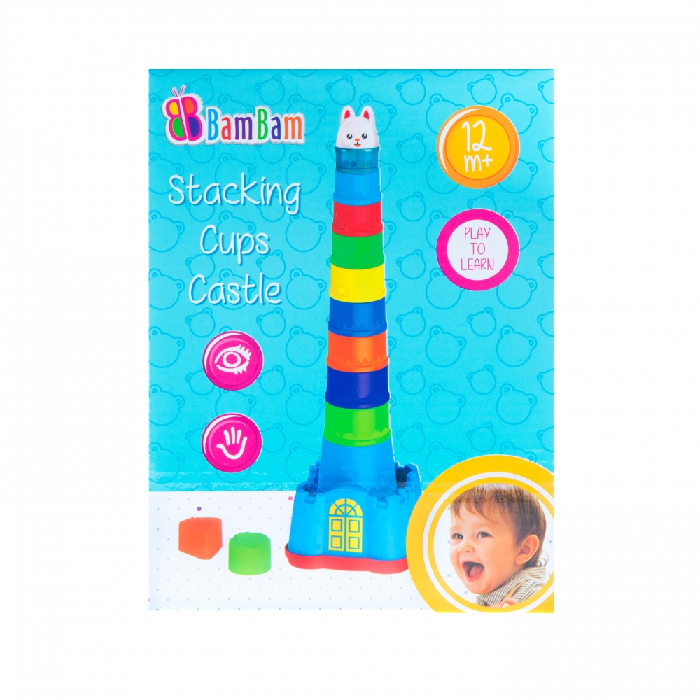 Osiem pasujących do siebie kubeczków, z których po ułożeniu jeden na drugi można wznieść wieżę na wysokość aż 58 cm, osadzoną na podstawie średniowiecznego zamku.