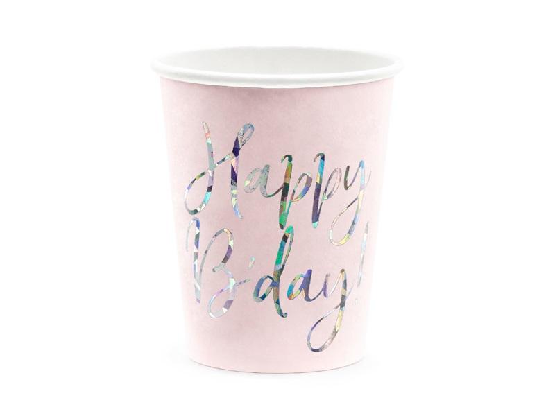 Kubeczki papierowe w kolorze jasnego pudrowego różu z holograficznym napisem Happy B'day!, pojemność ok. 220 ml. Kubki na napoje zawierają oznaczenia wymagane przez Rozporządzenie wykonawcze Komisji (UE) 2020/2151 z dnia 17 grudnia 2020 r. ustanawiające zasady dotyczące zharmonizowanych specyfikacji w odniesieniu do oznakowania produktów jednorazowego użytku z tworzyw sztucznych wymienionych w części D załącznika do dyrektywy Parlamentu Europejskiego i Rady (UE) 2019/904 w sprawie zmniejszenia wpływu niektórych produktów z tworzyw sztucznych na środowisko. Produkt zawiera etykietę wyłącznie w języku polskim, niemieckim, czeskim, francuskim, niderlandzkim, słowackim, słoweńskim i bułgarskim.(1 op. / 6 szt.)