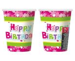Kubeczki papierowe w kolorze różowym zdobione białym i zielonym motywem. Na środku widnieje wielobarwny napis: "Happy Birthday" W skład zestawu wchodzi 6 sztuk. Pojemność 270ml. Przeznaczone zarówno da napojów zimnych jak i ciepłych.