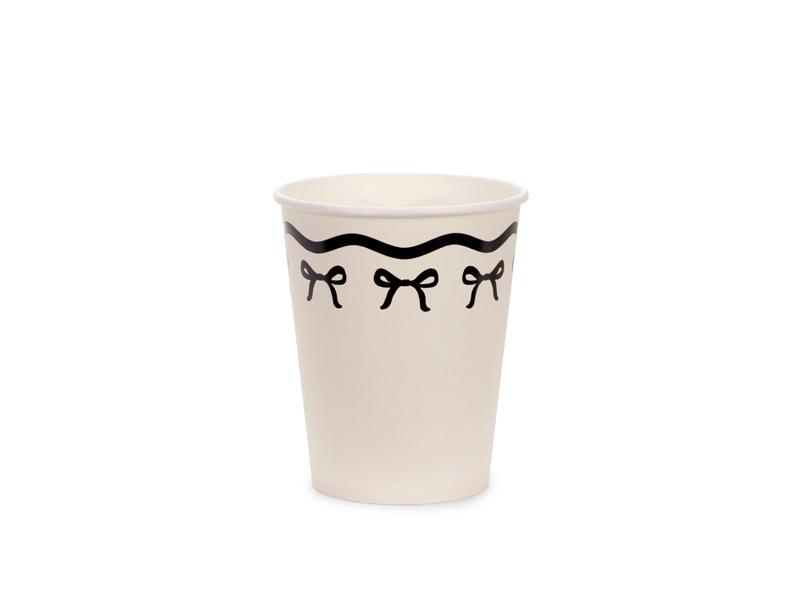 Kubeczki papierowe w kolorze kremowym z czarnymi kokardkami, wysokość ok. 9 cm, pojemność ok. 220 ml (7.4 oz). Kubki na napoje zawierają oznaczenia wymagane przez Rozporządzenie wykonawcze Komisji (UE) 2020/2151 z dnia 17 grudnia 2020 r. ustanawiające zasady dotyczące zharmonizowanych specyfikacji w odniesieniu do oznakowania produktów jednorazowego użytku z tworzyw sztucznych wymienionych w części D załącznika do dyrektywy Parlamentu Europejskiego i Rady (UE) 2019/904 w sprawie zmniejszenia wpływu niektórych produktów z tworzyw sztucznych na środowisko. Produkt zawiera etykietę wyłącznie w języku polskim, niemieckim, czeskim, francuskim, niderlandzkim, słowackim, słoweńskim i bułgarskim.(1 op. / 6 szt.)