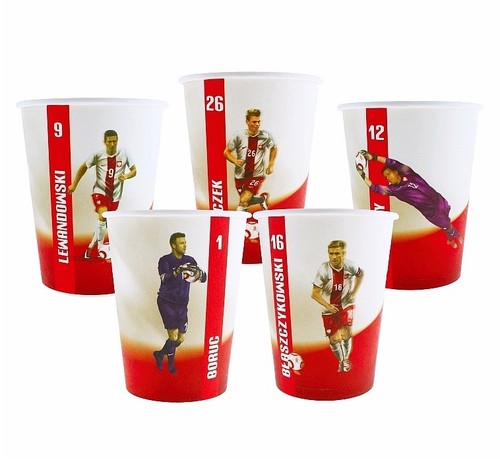 Komplet sześciu papierowych kubeczków o pojemności 270 ml, ozdobionych wizerunkami piłkarzy reprezentacji Polski.