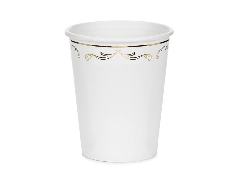 Kubeczki papierowe w kolorze białym ze złotym ornamentem. Wysokość ok. 9 cm, pojemność ok. 220 ml (7.4 oz). Produkt jednorazowego użytku. Nie używać do gorących napojów. Kubki na napoje zawierają oznaczenia wymagane przez Rozporządzenie wykonawcze Komisji (UE) 2020/2151 z dnia 17 grudnia 2020 r. ustanawiające zasady dotyczące zharmonizowanych specyfikacji w odniesieniu do oznakowania produktów jednorazowego użytku z tworzyw sztucznych wymienionych w części D załącznika do dyrektywy Parlamentu Europejskiego i Rady (UE) 2019/904 w sprawie zmniejszenia wpływu niektórych produktów z tworzyw sztucznych na środowisko. Produkt zawiera etykietę wyłącznie w języku PLskim, niemieckim, czeskim, francuskim, niderlandzkim, słowackim, słoweńskim i bułgarskim.(1 op. / 6 szt.)
