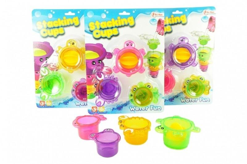 Kubeczki zwierzątka do kąpieli firmy Toi-Toys przedstawiają różne zwierzęta wodne, które można dowolnie układać w wieże i przelewać przez nie wodę. Dostępne są w 4 różnych wzorach. Każdy zestaw zawiera trzy różnokolorowe kubeczki. Kolor wysyłany losowo.