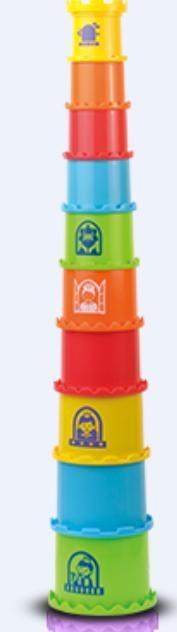 Dziecko ma do dyspozycji 10 kubeczków o różnej wielkości i kolorach, każdy oznaczony cyferką. Maluch może ułożyć z kubeczków wieżę, której wysokość to, aż 55 cm! Dzięki temu, że kubeczki są ponumerowane dziecko układa je po kolei i uczy się liczyć. Kubeczki mogą służyć również jako zabawka do piaskownicy. Zabawka wpływa na kształtowanie koordynacji wzrokowo-ruchowej, zdolności motorycznych oraz uczy liczb. Zabawka przeznaczona dla dzieci od 12 m