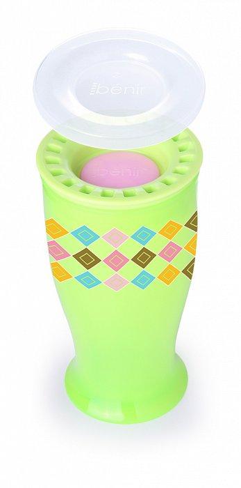 Kubek 360 stopni. Opatentowany system zapobiegający wyciekaniu. Zawiera specjalną uszczelkę dzięki której płyn nie wycieknie z kubka dopóki dziecko nie zacznie go sączyć z dowolnej strony na obręczy. Kubek nauczy dziecko jak przejść z picia z kubka-niekapka do picia ze szklanki. Posiada ochronne wieczko, które pomaga utrzymać czystość. Nie zawiera BPA ani ftalanów. Pojemność: 250ml. Wiek: 9m+