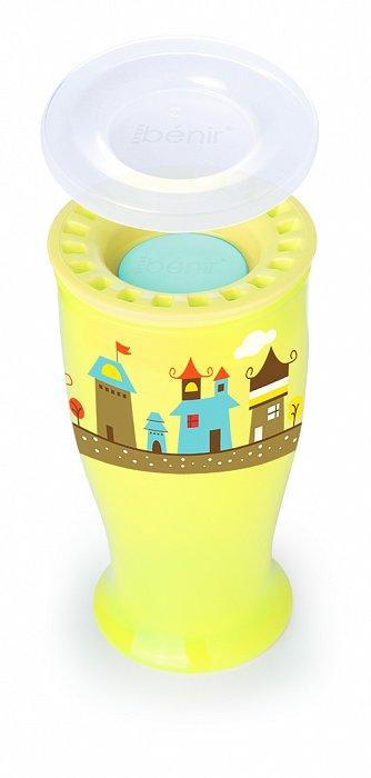 Kubek 360 stopni. Opatentowany system zapobiegający wyciekaniu. Zawiera specjalną uszczelkę dzięki której płyn nie wycieknie z kubka dopóki dziecko nie zacznie go sączyć z dowolnej strony na obręczy. Kubek nauczy dziecko jak przejść z picia z kubka-niekapka do picia ze szklanki. Posiada ochronne wieczko, które pomaga utrzymać czystość. Nie zawiera BPA ani ftalanów. Pojemność: 250ml. Wiek: 9m+