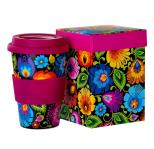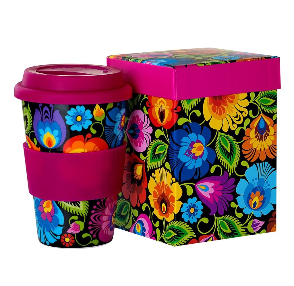 Łowicki kubek termiczny - czarny: ceramiczny z nadrukowanym kwiatowym wzorem łowickim na czarnym tle, wzór ludowy znajduje się na całej powierzchni kubka,posiada silikonową ciemnoróżową obręcz chroniącą przed poparzeniem, z wygodnym silikonowym wieczkiem, umożliwiającym picie z dziubka,pojemność 350 ml,higieniczny i łatwy do mycia, można myć w zmywarce,ozdobne pudełko w zestawie gotowy prezent,sprawdzi się na prezent lub jako pamiątka z Polski.