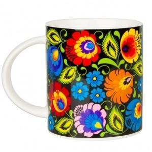Czarny łowicki FOLK kubek w kwiaty z wycinanki