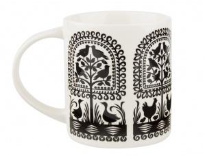FOLK kubek ozdobiony czarnymi motywami kurpiowskimi.