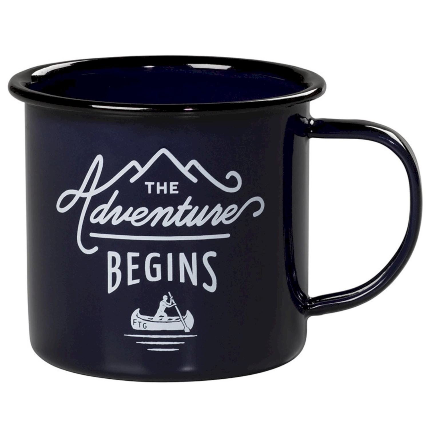 Emaliowany, metalowy kubek kempingowy „Adventure Begins” w stylu vintage to przydatny prezent dla aktywnego mężczyzny.