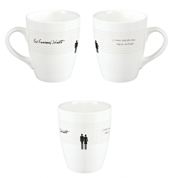 Zadrukowany kubek z motywem z książki Małe zbrodnie małżeńskie opakowany w eleganckie pudełko. Kubek jest opatrzony cytatem [...] wolność wtedy tylko istnieje, kiedy się z niej korzysta.  Można go myć w zmywarce.   Miłość młodzieńcza, niespełniona, zakazana. Miłość, która prowadzi do zbrodni i na którą czeka się całe życie. Nikt piękniej od Schmitta nie przedstawia tak wielu odcieni tego wyjątkowego uczucia. Kolekcja kubków oparta na czterech najpiękniejszych opowiadaniach o miłości, nadziei i przyjaźni, wzbogacona pięknymi ilustracjami jest prezentem dla wszystkich wielbicieli prozy E.-E. Schmitta. W kolekcji znajdują się kubki z motywami z powieści Małe zbrodnie małżeńskie, Oskar i Pani Róża, Odette i inne Historie Miłosne oraz