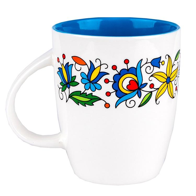 FOLK kubek z wnętrzem w kolorze niebieskim oraz tradycyjnymi wzorami kaszubskimi dookoła kubka: zdobienia na folk kubku stylizowane na ludowo,