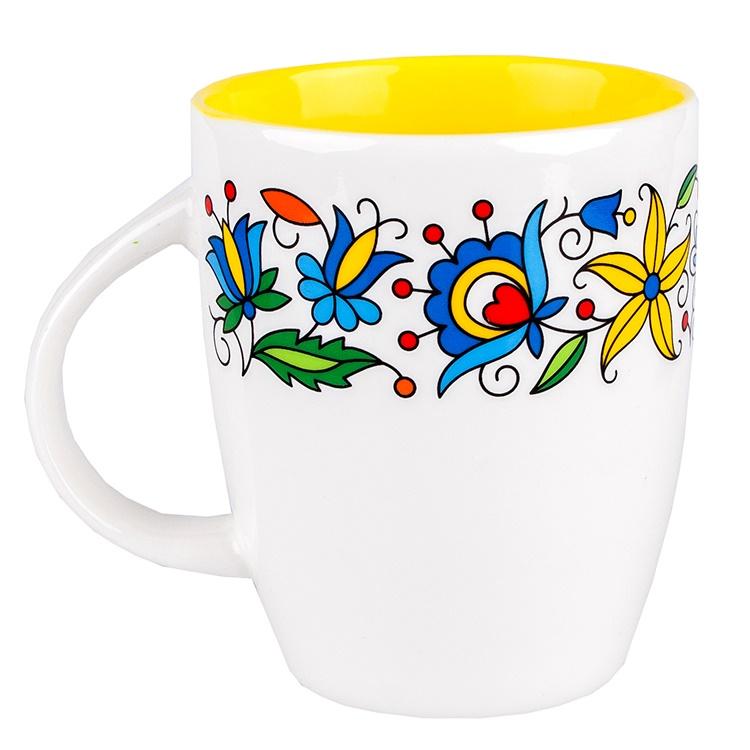 FOLK kubek z wnętrzem w kolorze żółtym oraz tradycyjnymi wzorami kaszubskimi dookoła kubka: zdobienia na folk kubku stylizowane na ludowo,
