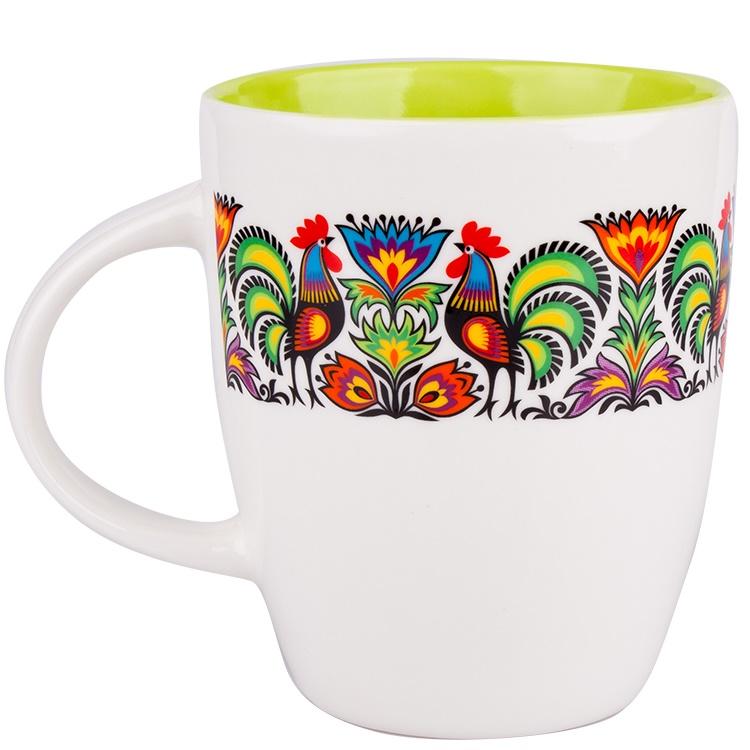 Folk kubek - wycinanka kogut z zielonym środkiem: folk kubek stylizowany jest na ludowo,niepowtarzalne i oryginalne motywy łowickie zachwycają intensywną gamą kolorów,wzór ludowy inspirowany tradycyjną wycinanką łowicką,podstawowymi elementami wycinanek łowickich są koguty, pawie oraz kwiaty,kubek folk wykonany z lekkiej porcelany, waży 230 g,folk kubek będzie idealnym polskim prezentem