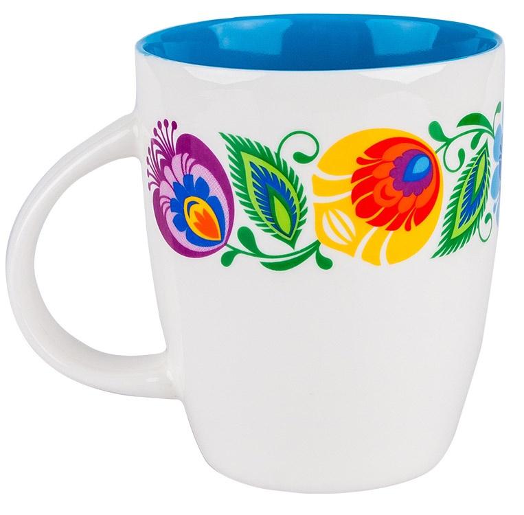 folk kubek stylizowany jest na ludowo,niepowtarzalne i oryginalne motywy łowickie zachwycają intensywną gamą kolorów,wzór ludowy inspirowany tradycyjną wycinanką łowicką,podstawowymi elementami wycinanek łowickich są koguty, pawie oraz kwiaty,kubek folk wykonany z lekkiej porcelany, waży 230 g ,folk kubek będzie idealnym polskim prezentem
