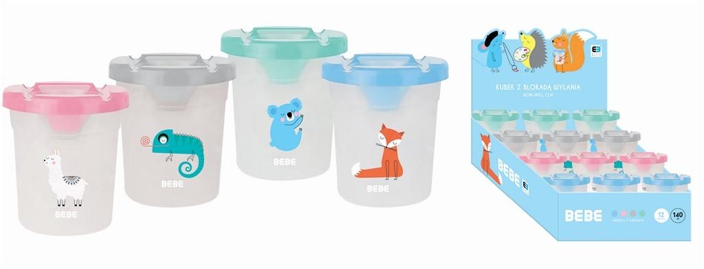 Pojemność: 140 ml. Kubek dla najmłodszych ze specjalną blokadą przeciw wylaniu wody. Praktyczne wgłębienia w pokrywce służą do odkładania pędzli, a dodatkowa zatyczka umożliwi bezpieczne przenoszenie pełnego kubka. Na kubku podobizny zwierzaków BEBE w 4 wzorach - z lamą, koalą, kameleonem lub lisem. Towar wysyłany losowo.