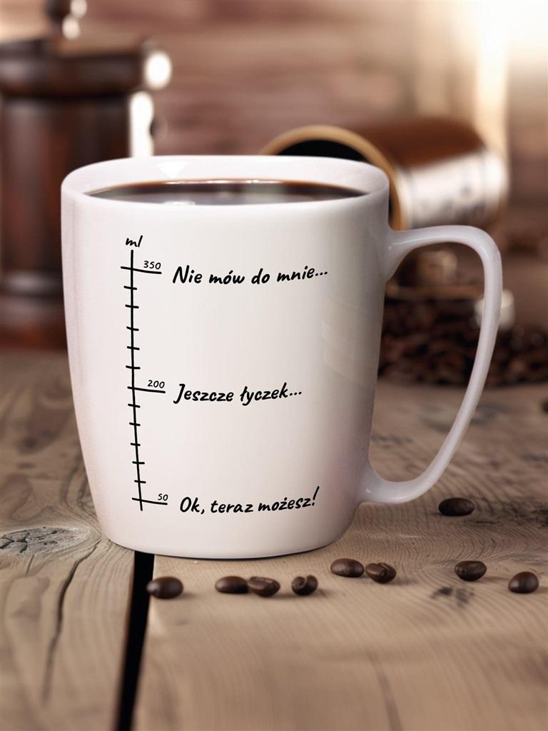 Nie mów do mnie teraz... chyba że masz drugą kawę! Przedstawiamy wyjątkowy kubek stworzony dla prawdziwego kawosza. Obserwuj, jak wraz z każdym łykiem Twoja chęć na rozmowę stopniowo rośnie. Gdy kubek jest pełen, potrzebujesz chwili wytchnienia, a gdy na dnie zostaje już tylko kilka kropel aromatycznego napoju, jesteś gotowy na podbicie świata. Ten kubek to historia o poranku każdego z nas. Wyobraź sobie tę scenę: budzisz się, słońce leniwie przebija się przez zasłony, a Ty sięgasz po swoją ulubioną filiżankę. Pierwszy łyk... i świat zwalnia. To właśnie ten moment, kiedy potrzebujesz chwili tylko dla siebie, kiedy nawet najlepszy przyjaciel/mąż/dziecko może poczekać. Podaruj ten kubek sobie lub komuś bliskiemu, kto tak jak Ty docenia magię porannej kawy. Idealny prezent dla miłośnika kawy istnieje! Kubek z porcelany Pojemność: 380 ml Pojemność użytkowa: 360 ml Zapakowany w szykowny kartonik Idealny prezent dla kawosza Nadruk po dwóch stronach kubka, logo na spodzie Można myć w zmywarce