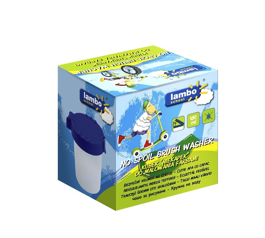 Plastikowy kubek na wodę Lambo School o pojemności 150 ml z blokadą wylania i dodatkową zatyczką. Nalewając wodę do odpowiedniego poziomu, unikniemy jej wylania w przypadku przewrócenia kubka.