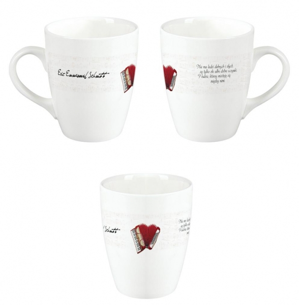 Zadrukowany kubek z motywem z książki Odette i inne historie miłosne opakowany w eleganckie pudełko. Kubek jest opatrzony cytatem "Nie ma ludzi dobrych i złych, są tylko złe albo dobre uczynki. I ludzie, którzy miotają się między nimi". Można go myć w zmywarce. Miłość młodzieńcza, niespełniona, zakazana. Miłość, która prowadzi do zbrodni i na którą czeka się całe życie. Nikt piękniej od Schmitta nie przedstawia tak wielu odcieni tego wyjątkowego uczucia. Kolekcja kubków oparta na czterech najpiękniejszych opowiadaniach o miłości, nadziei i przyjaźni, wzbogacona pięknymi ilustracjami jest prezentem dla wszystkich wielbicieli prozy E.-E. Schmitta. W kolekcji znajdują się kubki z motywami z powieści Małe zbrodnie małżeńskie, Oskar i Pani Róża, Odette i inne Historie Miłosne oraz Marzycielka z Ostendy.