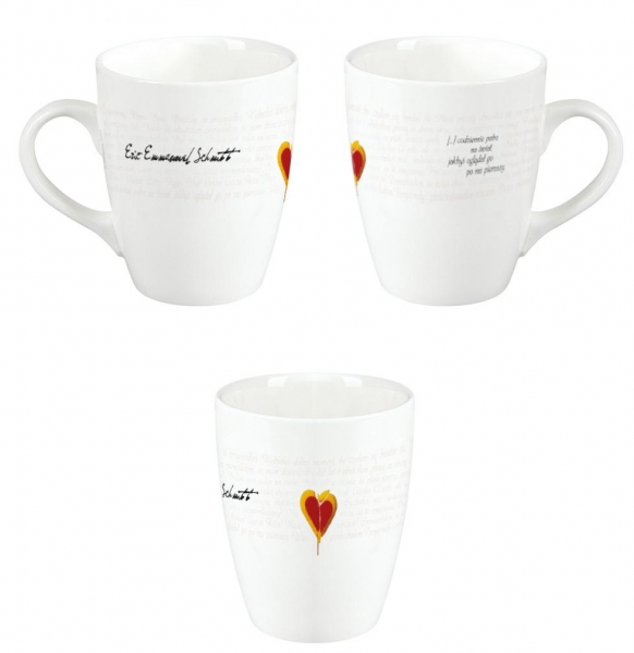 Zadrukowany kubek z motywem z książki Oskar i pani Róża opakowany w eleganckie pudełko. Kubek jest opatrzony cytatem [...] codziennie patrz na świat, jakbyś oglądał go po raz pierwszy. Można go myć w zmywarce. Miłość młodzieńcza, niespełniona, zakazana. Miłość, która prowadzi do zbrodni i na którą czeka się całe życie. Nikt piękniej od Schmitta nie przedstawia tak wielu odcieni tego wyjątkowego uczucia. Kolekcja kubków oparta na czterech najpiękniejszych opowiadaniach o miłości, nadziei i przyjaźni, wzbogacona pięknymi ilustracjami jest prezentem dla wszystkich wielbicieli prozy E.-E. Schmitta. W kolekcji znajdują się kubki z motywami z powieści Małe zbrodnie małżeńskie, Oskar i Pani Róża, Odette i inne Historie Miłosne oraz Marzycielka z Ostendy.
