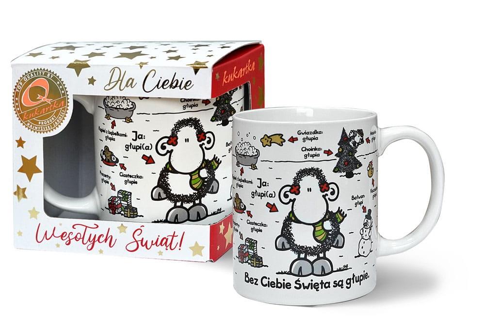 Kubek Premium Sheep Boże Narodzenie "Bez Ciebie Święta są głupie" Q 984 Kubek Premium Kukartka na licencji Sheepworld to dobrego wzornictwa i jak zwykle - świetnych tekstów. Każdy kubek Premium to idealny pomysł na prezent na wyjątkową okazję - wzory są oryginalne, zdobione złotem i pakowane w piękne pudełeczko. *OPAKOWANIA WYSTĘPUJĄ W RÓŻNYCH KOLORACH: CZARNY, NIEBIESKI, GRANATOWY, RÓŻOWY, BIAŁY I MIĘTOWY. KOLORY OPAKOWAŃ SĄ WYBIERANE LOSOWO. Cechy szczególne: Typ produktu: kubek na prezent, Materiał: porcelana, Pojemność: 300ml Opakowanie: ozdobny kartonik złocony, Okazja: Boże Narodzenie