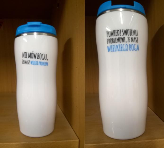 Z jednej strony kubka znajduje się napis: Nie mów Bogu, że masz wielki problem.