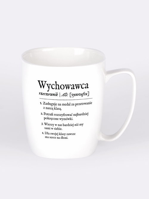 Nie pyta: „Czy”, tylko: „Jak się czujesz?”. Kubek WYCHOWAWCA jest dla tych, którzy znają całą klasę lepiej niż dziennik elektroniczny. Ma wszystko, co trzeba: definicję, która trafia w punkt, i miejsce na porządną kawę. Idealny na przerwę między wychowawczą a zebraniem. Kubek WYCHOWAWCA z nadrukowaną definicją to świetny prezent dla nauczyciela, który pełni funkcję opiekuna klasy. Klasyczny biały kubek z uchem, pojemność 380 ml, wyrazisty nadruk – dla tych, którzy wspierają, ogarniają i są zawsze na miejscu. Do szkoły i do domu. Szukasz prezentu dla wychowawcy klasy na koniec roku? Ten kubek sprawdzi się idealnie. To praktyczny i symboliczny upominek. Biały kubek z porcelany Pojemność: 380 ml Pojemność użytkowa: 360 ml Zapakowany w elegancki kartonik – idealny na prezent dla wychowawcy Nadruk po dwóch stronach kubka, logo na spodzie Można myć w zmywarce