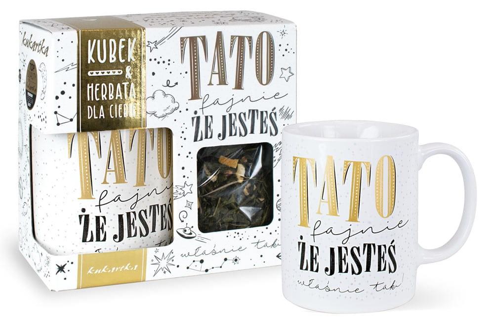 Zestaw ten zawiera dwa nasze megahity kubek i herbatkę. Atrakcyjny kubek oraz aromatyczna herbatka, to idealnie uzupełniające się produkty tworzące piękny i wartościowy upominek z okazji Dnia Ojca. Wzornictwo jak zawsze z najwyższej półki. Całość elegancko opakowana. Typ produktu: kubek na prezent, pojemność 300ml, materiał: porcelana, herbata skład: waga netto: 50g najwyzszej jakości herbaty Opakowanie: ozdobny złocony kartonik.