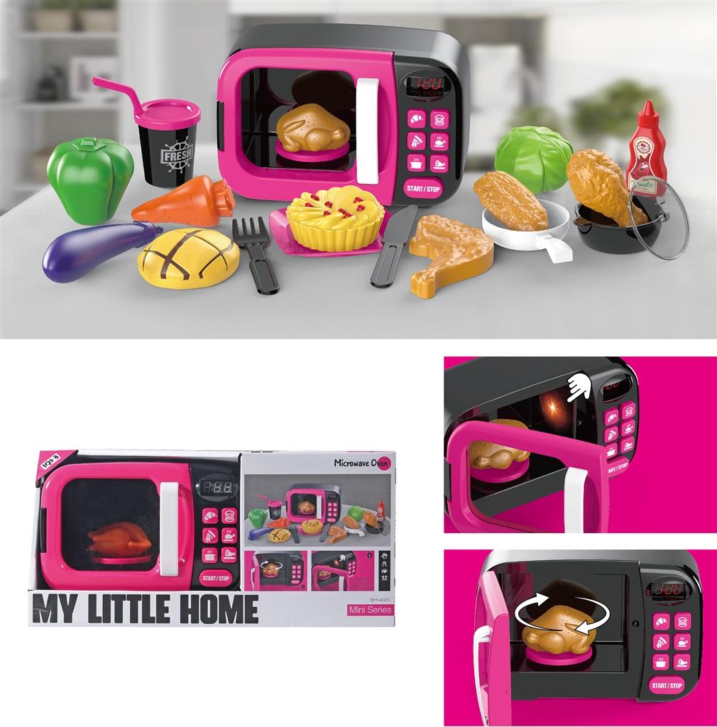 Zabawkowa kuchenka mikrofalowa z akcesoriami. Kuchenka na baterie: świeci, kręci się talerz wewnątrz, wydaje odgłosy. W komplecie z zabawkową imitacją artykułów spożywczych.
