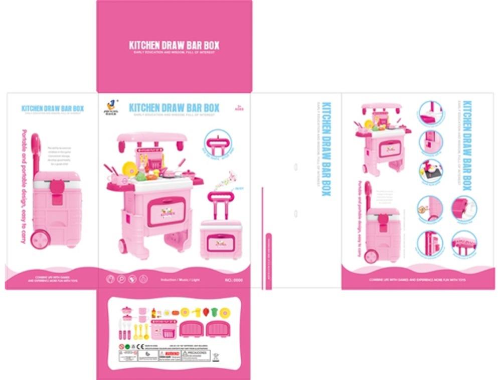Kuchenka w kolorze różowym z wieloma akcesoraimi, zamknęta została w poręczną walizkę/wózek który przekształca się w stojącą kuchenkę.
