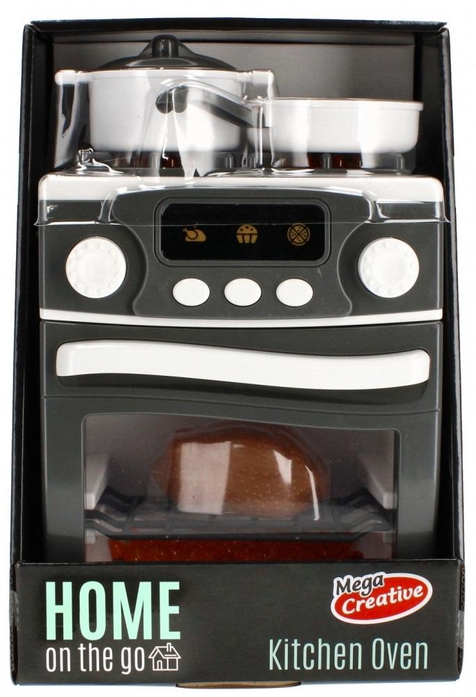 Zalety produktu: posiada efekty dźwiękowe oraz świetlne, po naciśnięciu odpowiedniego programu pieczenia zapala się lampka, w piekarniku, kuchenka posiada otwierane drzwiczki piekarnika oraz wysuwaną kratkę ze środka, posiada elektroniczny wyświetlacz gdzie obliczany jest czas pieczenia, kuchenka w kolorze szarym. Kuchnia MEGA CREATIVE to propozycja ciekawej i wciągającej zabawy dla dzieci, które chętnie naśladują zajęcia dorosłych i w bezpieczny sposób mogą bawić się w małych kucharzy. Ciekawy i nowoczesny design, a także ładna i żywa kolorystyka to tylko niektóre cechy tej kuchni! Można tu znaleźć płytę z dwoma polami grzejnymi, kurki do sterowania kuchenką są ruchome. Zawartość zestawu: kuchenka, garnek z pokrywką, patelnia. Całość wykonana z plastiku. Wymiary/waga/baterie: wymiary produktu (dł. x wys. x gł.) [cm]: 18x23x14, wymiar opakowania (dł. x wys. x gł.) [cm]: 19x29x15, waga produktu bez opakowania [kg]: 0,61 kg, waga produktu w opakowaniu [kg]: 0,87 kg, wymaga zasilania bateriami 3 x AA- nie załączono do zestawu. Zabawka przeznaczona dla dzieci w wieku: 3+. Pakowana w kartonik z okienkiem.