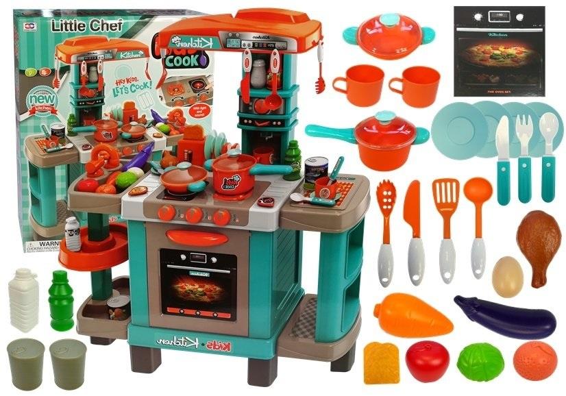 Duża Kuchnia dla dzieci Toster Ekspres Turkusowa Ten dużych rozmiarów zestaw kuchenny to prawdziwy rarytas dla każdej młodocianej pani domu. Utrzymane w turkusowych kolorach mebelki i sprzęt AGD jasno daje do zrozumienia, kto rządzi w kuchni! Gotowanie, pieczenie, smażenie, krojenie, mieszanie... Cała paleta możliwości! Jednak czym jest kuchnia bez produktów żywnościowych? Ich również można znaleźć w zestawie całą masę - warzywa, owoce a nawet żywność puszkowana będą świetnymi akcesoriami urozmaicającymi zabawę. Kuchnia posiada wiele ciekawych elementów: - palnik gazowy i płytę indukcyjną, które po uruchomieniu podświetlają się oraz wydają odgłos gotowania, - duży, pojemny piekarnik, z odgłosami pracy i alarmem, - toster, z którego po naciągnięciu guziczka wyskakują tosty - ekspres do kawy na kapsułki, - blat roboczy, - wygodne półeczki i haki na przybory kuchenne. W skład zestawu wchodzi: - rondelek, - patelnia z dwoma uchwytami, - 2 pokrywki, - 4 talerze, - 2 filiżanki, - przybory kuchenne: bezpieczny nóż, chochelka, łyżka do makaronu, łopatka, - sztućce: nóż, widelec, łyżka, - solniczka, - butelki z mlekiem, napojem i ketchupem, - kapsułki z nazwami różnych kaw: latte, black coffee, milk coffee, - artykuły spożywcze: pomarańcza, jabłko, kapusta, marchewka, bakłażan, jajko, nóżka kurczaka, tost, 2 konserwy Wymiary kuchni: wysokość - 87 cm szerokość - 78 cm głębokość - 29 cm Wymiary opakowania: 66 cm x 53 cm x 15.5 cm Do uruchomienia wszystkich funkcji kuchni potrzeba trzech baterii "AA" 1.5 V.