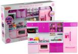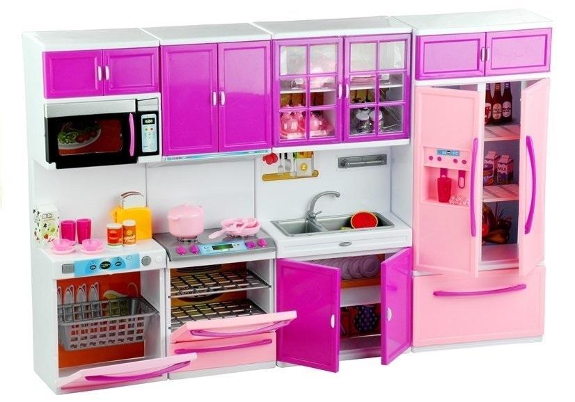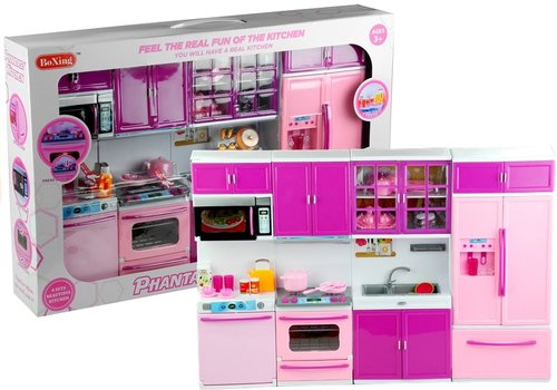 Różowo-fioletowe meble kuchenne i akcesoria AGD dla lalek Kuchnia jest sercem każdego domu. Kompletując wyposażenie domku dla lalek, warto wyposażyć go w akcesoria, których nie powinno zabraknąć w każdym mieszkaniu. Na prezentowany komplet składają się cztery osobne segmenty, które mała dekoratorka może rozmieścić w domku dla lalek według własnego pomysłu. Zestaw jest pełnym wyposażeniem kuchni, składają się na niego meble, produkty AGD, zastawa i smakołyki. Zabawa z wykorzystaniem elementów kuchennych pozytywnie wpłynie na wyobraźnię dziewczynki, równocześnie rozwijając jej samodzielność, a także zdolności manualne oraz kreatywność. Zestaw składa się z czterech głównych elementów: - zmywarki i mikrofalówki, - kuchenki z piekarnikiem, - zlewozmywaka, - lodówki. Różowo-fioletowa kuchnia z pewnością rewelacyjnie wpasuje się do pozostałych wnętrz w domku dla lalki. Konstrukcja mebli kuchennych i pozostałych akcesoriów posiada ruchome elementy - umożliwia to otwieranie i zamykanie drzwiczek, a także umieszczanie w półkach zastawy i jedzenia. Wciśnięcie przełącznika na tosterze sprawi, że wyskoczą z niego fantastyczne grzanki. Dużym atutem prezentowanego zestawu są efekty świetlne i dźwiękowe. Guziczek umieszczony na kuchence odpowiada za uruchomienie dźwięków przypominających gotowanie, sprawia również, że zaświeca się światełko w piekarniku. W zestawie znajdują się przeróżne akcesoria - podstawowe artykuły spożywcze, owoce, talerze, garnki, patelnia, serwis kawowy, toster i szklanki. W zmywarce umieszczony jest kosz na brudne naczynia, natomiast w piekarniku umieszczone są dwa, wysuwane ruszty. W szafkach i lodówce znajduje się miejsce na produkty spożywcze, dzięki czemu w kuchni lalki może panować porządek. Prezentowany zestaw posiada certyfikat CE, jest zgodny z normą EN 71. Stworzono go z atestowanych, bezpiecznych dla dzieci materiałów, dźwięki czemu zabawa będzie bezpieczna. Wszelkie efekty świetlne i dźwiękowe działają prawidłowo po zasileniu zabawki 2 sztukami baterii "AAA" 1,5 V, które umieszczone są w elementach. Kuchnia dostosowana jest do wszystkich dziewczynek w wieku powyżej 3. roku życia. Zapakowana jest w estetyczne pudełko z przeźroczystą witrynką i rączką umieszczoną w górnej części opakowania. Wymiary elementów kuchni: - cała kuchnia: 52 cm x 32 cm x 7,5 cm, - segment ze zmywarką: 10,5 cm x 32 cm x 7,5 cm, - segment z piekarnikiem: 10,5 cm x 32 cm x 7,5 cm, - segment ze zlewozmywakiem: 13,5 cm x 32 cm x 7,5 cm, - segment z lodówką: 13,5 cm x 32 cm x 7,5 cm. Wymiary opakowania: - 54,5 cm x 35 cm x 9,5 cm.