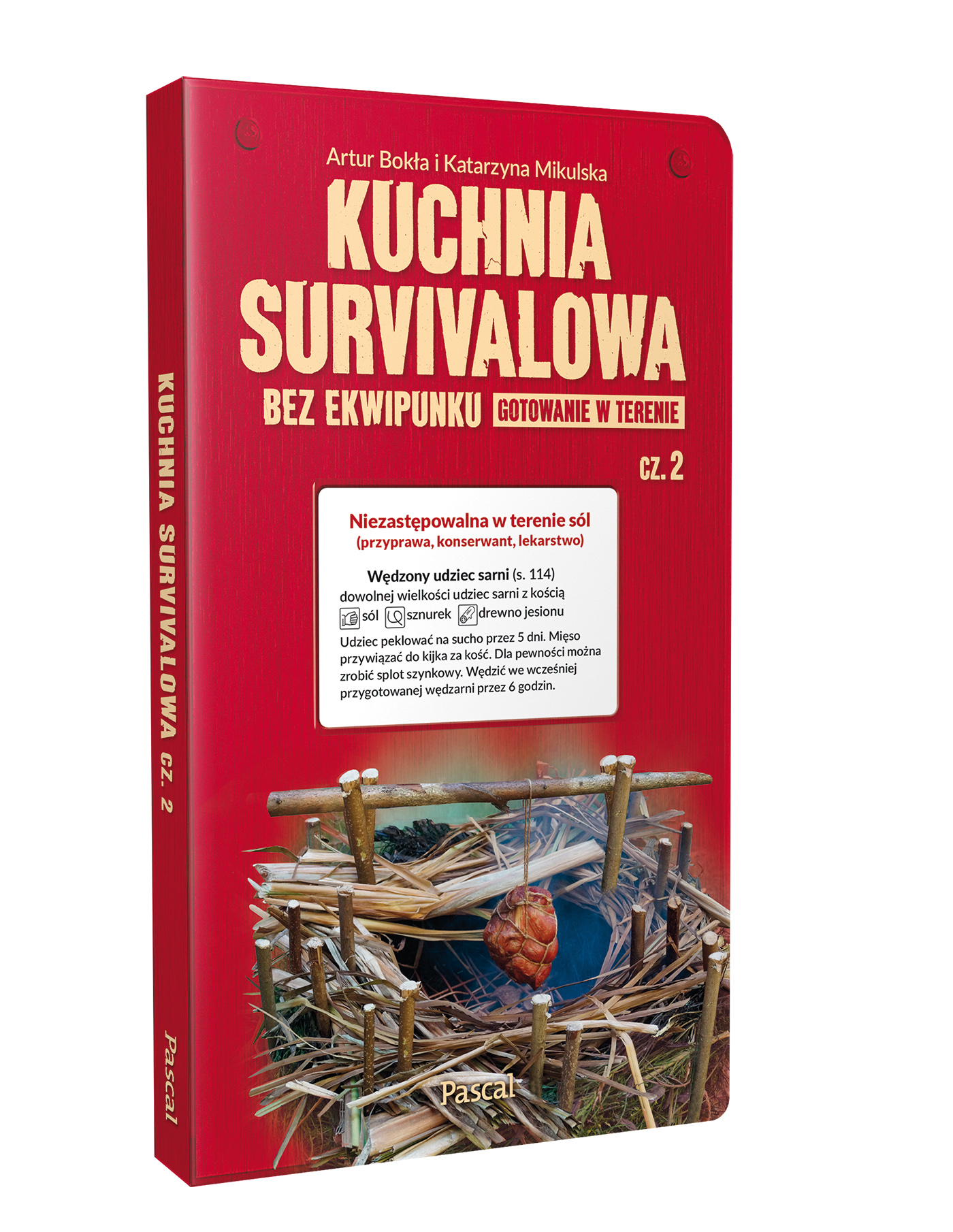 To nie tylko książka, ale stworzone z pasją narzędzie przetrwania. W tej części "Kuchni survivalowej" zaprezentowano różne sposoby wędzenia, krzesania ognia oraz tajniki doboru hubki i rozpałki. Poznasz techniki pieczenia – w glinie, na spodku, w piecu glinianym i pod kloszem. Bezcenna, sprawdzona w praktyce wiedza, która może uratować zdrowie, a nawet życie. Tylko przygotowani przetrwają! Toolbook zawiera: przepisy kulinarne z wykorzystaniem roślin łąkowych (np. mąka z kłączy perzu), leśnych (np. mąka z żołędzi) oraz bagiennych (np. ziołowe podpłomyki z mąką z pałki wodnej), prezentację technik gotowania w terenie (pieczenie w glinie, w glinianym piecu, wędzenie), techniki krzesania ognia oraz przygotowania hubki i rozpałki, filmy instruktażowe dostępne w aplikacji Pascal AR, sól, linijkę calową i centymetrową.