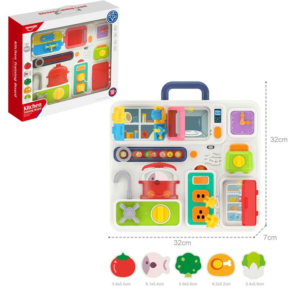 Kuchnia dla maluchów - tablica manipulacyjna Ruchome elementy do otwierania, przekręcania, dopasowywania, które usprawniają motorykę małej rączki i paluszków. Dodatkowo efekty świetlne i dźwiękowe urozmaicają zabawę. 5 plastikowych kształtów - pomidor, ryba, mięsko, brokuł, sałata wygodna rączka do przenoszenia wymiar tablicy manipulacyjnej - 32 x 7 x 32 cm zasilanie: 3xAA (brak w zestawie) Wiek: 18m+ Wymiary opakowania: 37x8x33 cm