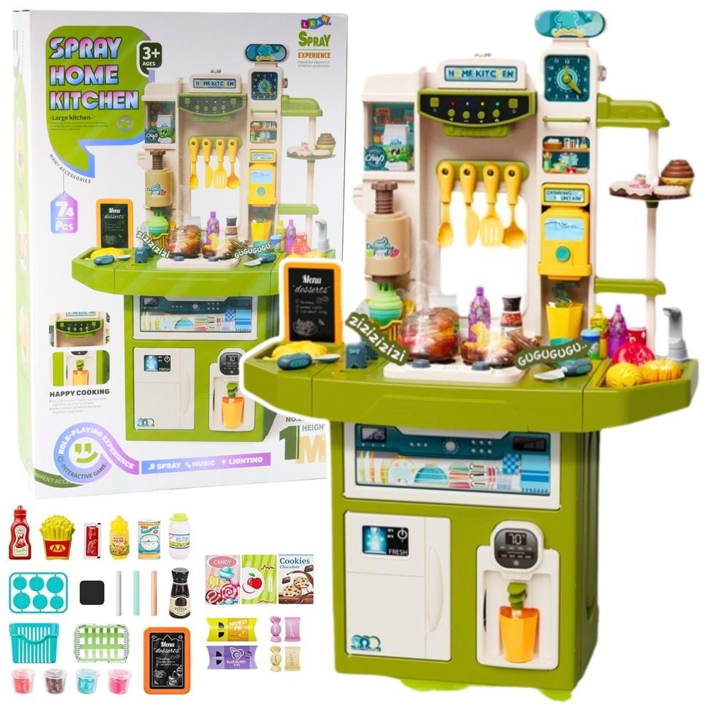 KUCHNIA DZIECIĘCA SPRAY HOME KITCHEN 71 ELEMENTÓW Duża kuchnia dziecięca SPRAY HOME KITCHEN to doskonały wybór dla małych pasjonatów gotowania. Wyposażona w aż 71 elementów, zapewnia dzieciom możliwość swobodnej, kreatywnej i realistycznej zabawy w gotowanie, pieczenie, podawanie posiłków oraz mycie naczyń. Bogaty zestaw akcesoriów obejmuje m.in. garnki, sztućce, produkty spożywcze, warzywa, owoce, talerze, napoje i przyprawy, dzięki czemu dziecko może poczuć się jak w prawdziwej kuchni. Zabawkowa kuchnia wyposażona została w szereg nowoczesnych funkcji interaktywnych: efekt pary wodnej, realistyczne dźwięki gotowania, kolorowe światła LED, a także muzykę i opowieści dźwiękowe, które aktywują się przy pomocy panelu sterującego. Takie rozwiązania gwarantują jeszcze więcej radości, wciągając dziecko w długą, angażującą zabawę. Konstrukcja kuchni jest solidna i osiąga wysokość aż 100 cm, co czyni ją wygodną i atrakcyjną nawet dla starszych dzieci. Znajduje się tu również zlew z działającym obiegiem wody, piekarnik z otwieranym frontem, kuchenka z palnikami oraz półki i schowki na akcesoria. Zabawa kuchnią to nie tylko przyjemność, ale też rozwój wyobraźni, zdolności manualnych i koordynacji wzrokowo-ruchowej. Odgrywanie ról w domowe obowiązki uczy dzieci samodzielności, organizacji oraz logicznego myślenia. To zabawka, która jednocześnie uczy, bawi i inspiruje, stając się świetnym sposobem na spędzenie czasu - samemu lub z rówieśnikami. SPECYFIKACJA: Wymiary kuchni: 70 x 34,2 x 100 cm Wymiary opakowania: 71 x 47,5 x 18,5 cm Zasilanie: 6 x 1.5V AA (brak w zestawie) Efekty: para wodna (spray), dźwięki gotowania, muzyka, światła LED Funkcje: zlew z kranem i obiegiem wody, palniki, panel dźwiękowy i świetlny Liczba elementów: 71 Materiał: tworzywo sztuczne ZAWARTOŚĆ ZESTAWU: Kuchnia z blatem, zlewem, półkami i piekarnikiem Garnki, patelnie, pokrywki, sztućce i chochle Butelki, warzywa, owoce, deska menu Produkty spożywcze i inne akcesoria