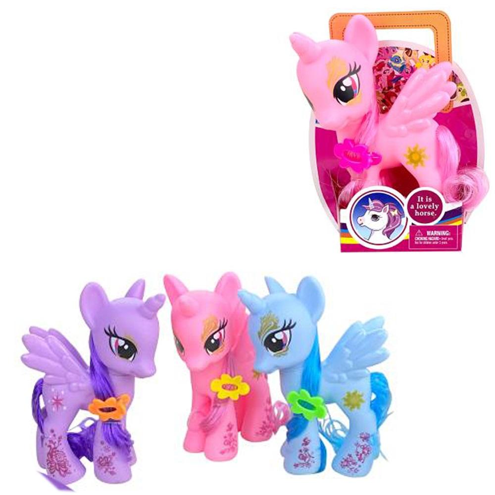 Kucyk Bajkowy jednorożec z brokatowymi skrzydłami występuje w 3 kolorach: fioletowym, różowym i niebieskim W zestawie znajduje się kucyk i spineczka Wymiary opakowania: 11.5 x 5 x 14.5 cm