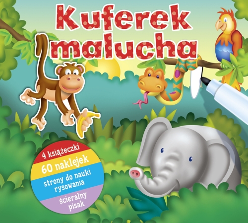 Maluchy mogą uzupełniać kolorowe ilustracje naklejkami oraz własnymi rysunkami i bawić się ćwiczyć spostrzegawczość, szukając kolorowych elementów, liczyć, naśladować różne dźwięki. W każdej książeczce instrukcje krok po kroku, jak rysować zwierzęta, pojazdy i zabawki. W Kuferku malucha dzieci znajdą: 4 książeczki ze stronami do nauki rysowania: W dżungli, W parku, Na wsi, W mieście, 60 naklejek oraz ścieralny pisak.