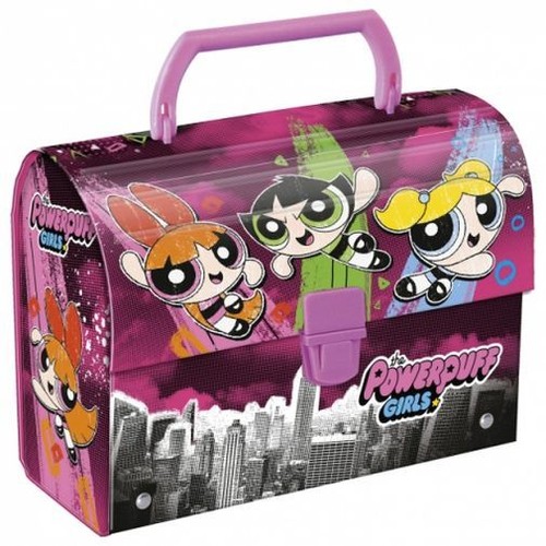 Kuferek z rączką wykonany z twardej tektury, pokryty PCV, zapinany plastikowym mechanizmem.