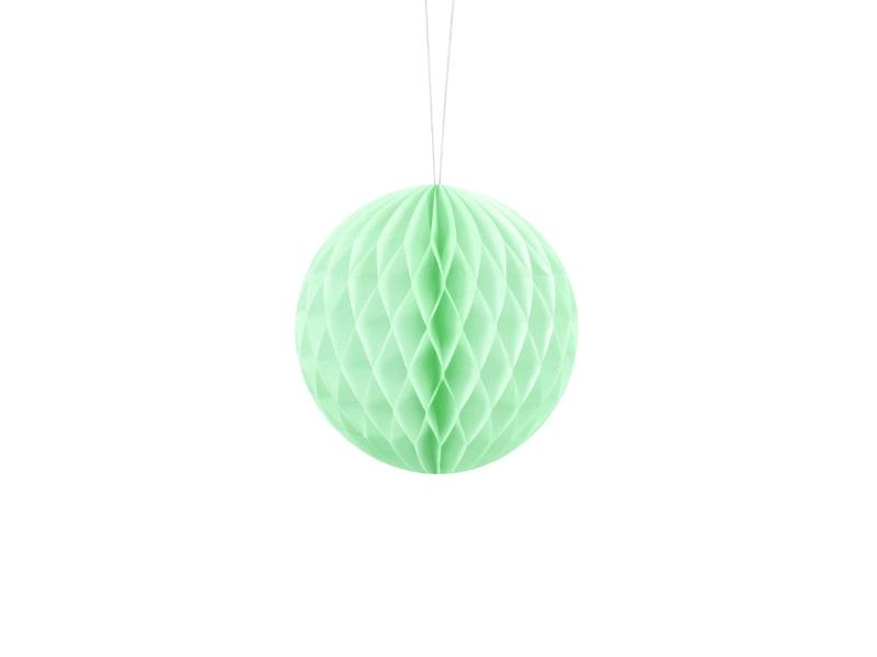 Kula bibułowa w kolorze pistacjowy, o średnicy około 10 centymetrów. Produkt wielokrotnego użytku. Montaż przy pomocy spinacza.