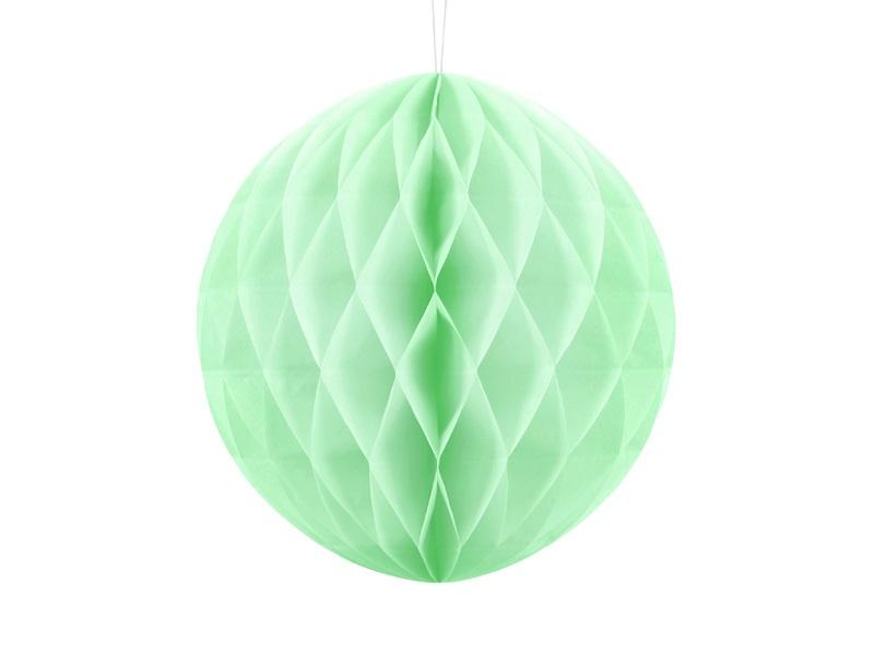 Kula bibułowa w kolorze pistacjowym o średnicy około 30 centymetrów. Produkt wielokrotnego użytku. Montaż przy pomocy spinacza.