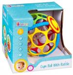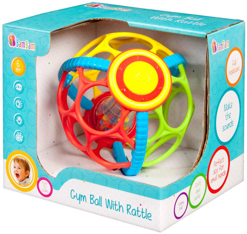Miękka, gumowa kula Bam Bam to doskonała zabawka rozwijająca zdolności manualne dzieci od 6 m-ca życia. Dzięki różnorodnej fakturze, kolorom oraz powierzchni wpływa na rozwój wielu zmysłów w tym zmysłu dotyku, słuchu, wzroku. Regularnie wycięte pierścienie ułatwiają chwytanie kuli oraz manewrowanie nią. Zamieszczona wewnątrz tuba z kolorowymi kuleczkami urozmaica zabawę oraz wzbogaca ją o efekty dźwiękowe przy potrząśnięciu. Kula, nawet po manewrach turlania, zgniatania czy toczenia zawsze powraca do swojego pierwotnego kształtu. Piękne opakowanie doskonale współgra z zabawką, czyniąc ja atrakcyjnym rozwiązaniem na prezent.