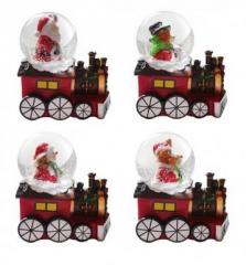 Kula śnieżna z podstawką w kształcie lokomotywy i postaciami świątecznymi. W zestawie 4 różne sztuki.