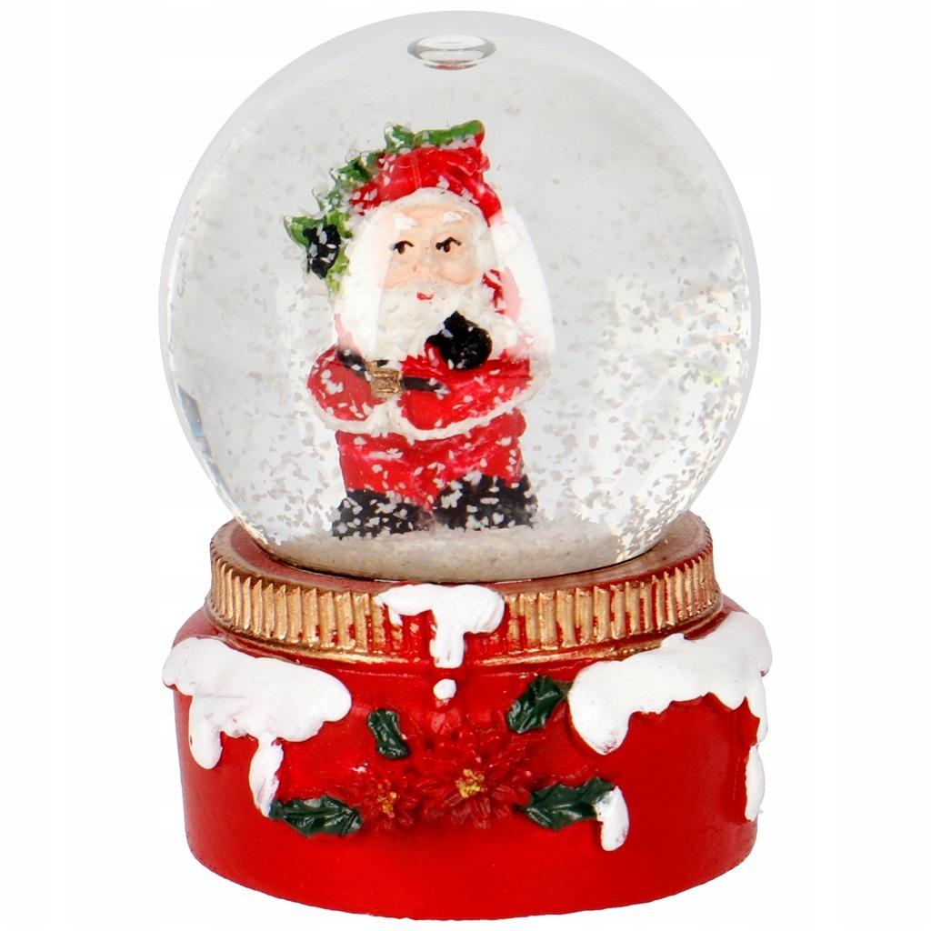 Kula śnieżna o średnicy 50mm. Na pięknej podstawie z poliresinu w kolorze czerwonym z motywem poinsetii.Kula wypełniona woda i sztucznym śniegiem. W kuli figurka o charakterze świątecznym.