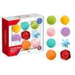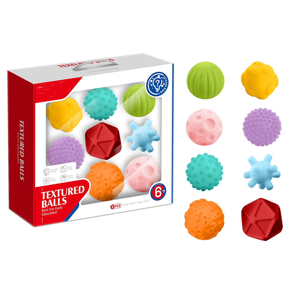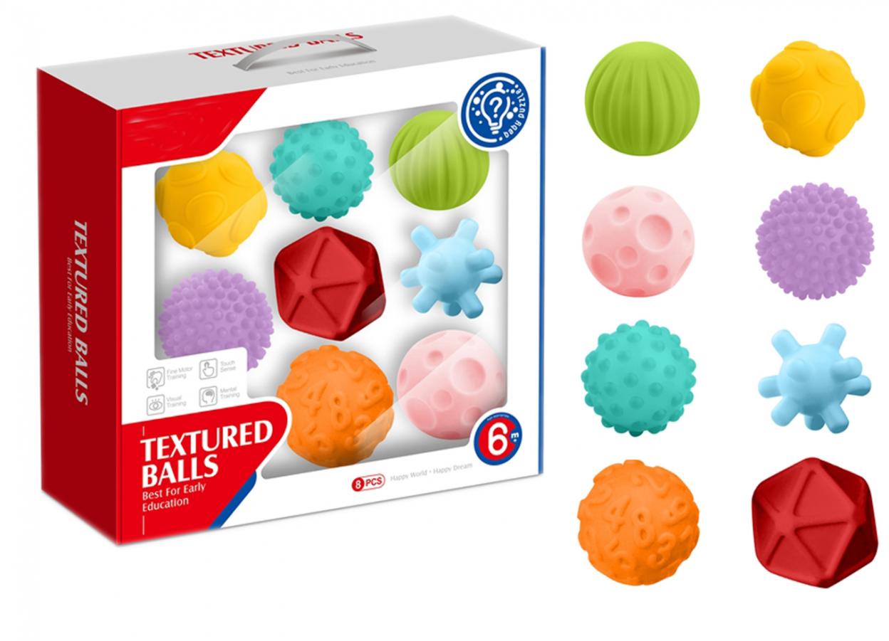 Zestaw 8 elementów zabawek sensorycznych Idealna zabawka dla malucha, bowiem ma wpływ na integrację sensoryczną dziecka, rozwija zmysł dotyku, wzrok, koordynację oraz motorykę rączek i paluszków. Każda element ma inny kształt, fakturę i kolor. Wielkością idealnie pasuje do małych rączek. Jest z miękkiego tworzywa bezpiecznego dla dziecka. Doskonałe do rzucania, toczenia, ściskania, a nawet żucia.
