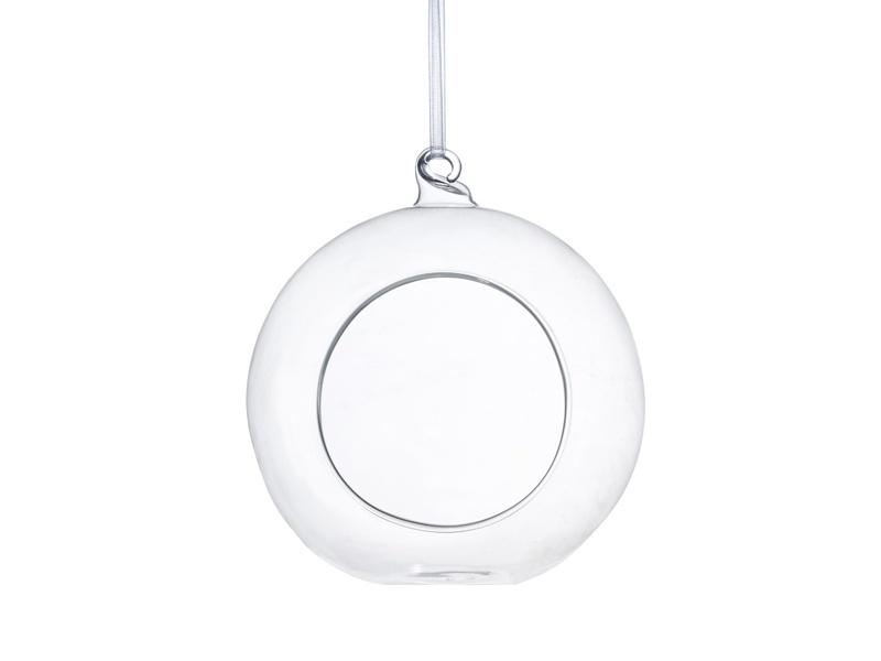 Kule szklane ze wstążką, średnica 10 centymetrów, średnica otworu ok. 5,5 centymetra, długość wstążki około 7,5 centymetra.(1 op. / 4 szt.)