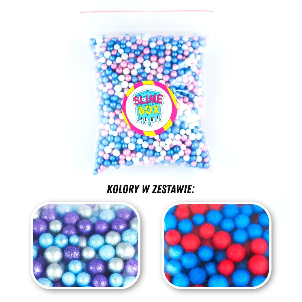 Zestaw dwóch mieszanek kolorystycznych kulek styropianowych. Kulki styropianowe są idealnym dodatkiem do masy plastycznej- slime. Niezbędne do stworzenia crunchy slime.
