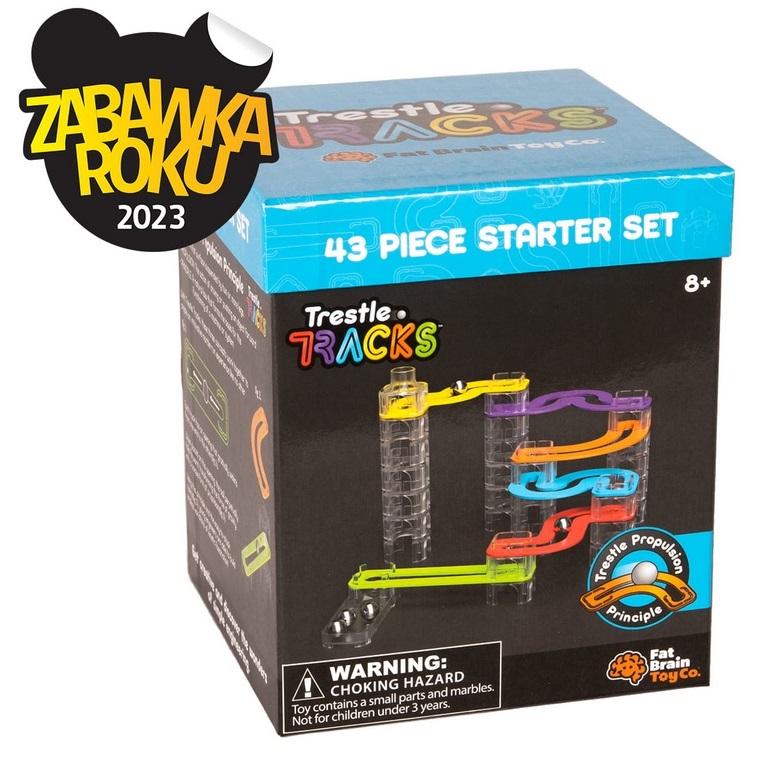 Zacznij zabawę od zestawu startowego, który zawiera 43 elementy w tym łapacz kulek, 5 metalowych kulek, 6 płaskich, kolorowych torów o różnych kształtach i 31 przezroczystych sześcianów. Zbuduj trzy labirynt dla kulek z instrukcją lub bądź kreatywny i odkryj cudowności Kulodromu Trestle Tracks.