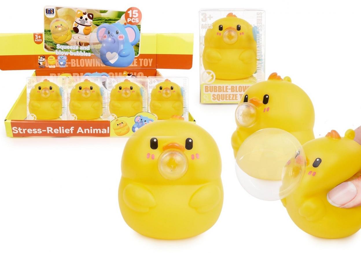 15 szt/disp; gniotek - kurczak; funkcje: ściśnięcie zabawki powoduje wytworzenie bąbelka; zabawkę można ciągnąć, ściskać, ugniatać; 3+